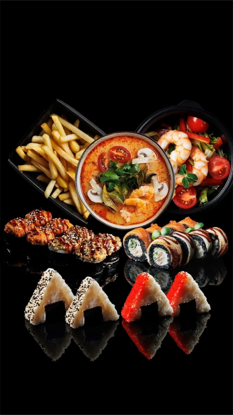 Том Ям, ролл Кото, ролл Статус, Темпура Box, салат Эби, Картофель фри, Онигири с угрём, Онигири спайси лосось